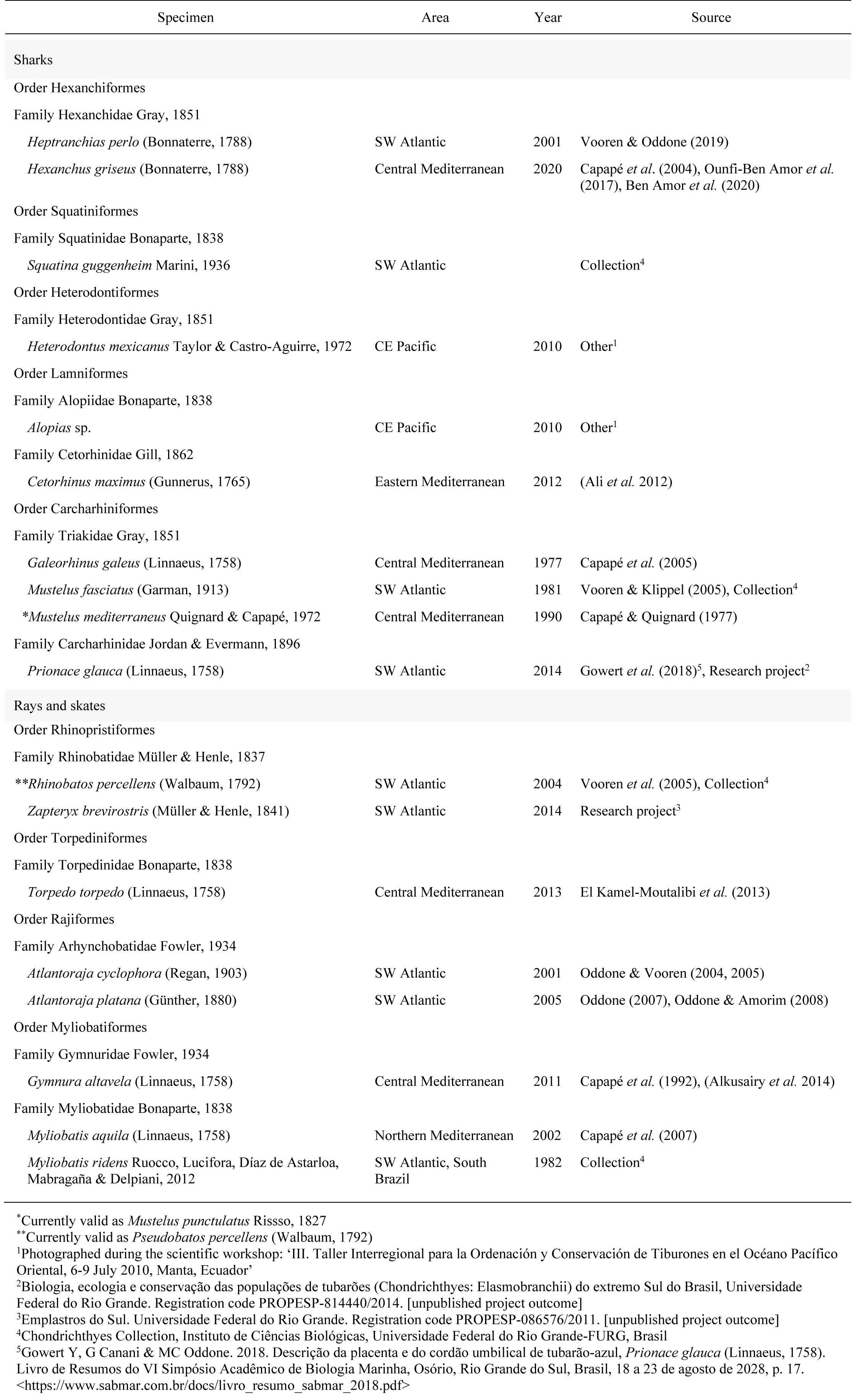 This is a correction and reprint of Table 1 published on page 105 of the article “Diversity of the egg tertiary membranes in some elasmobranch species and comments on the actual yolk-sac viviparous reproductive mode”, published in the special issue Chondrichthyes of Revista de Biología Marina y Oceanografía 57(Especial): 102-121. <https://doi.org/10.22370/rbmo.2022.57.Especial.3302>